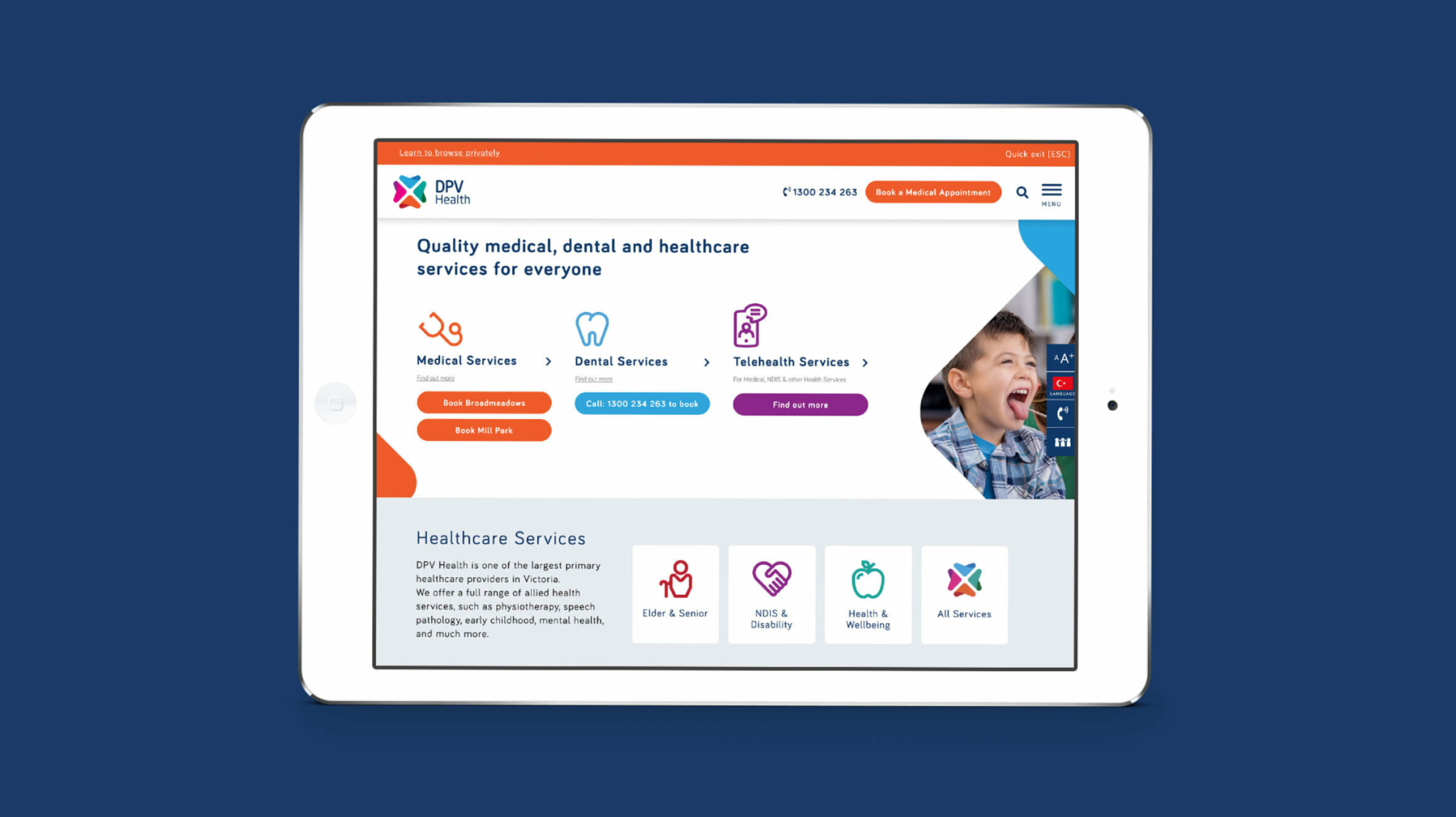 DPV Health were looking to represent their organisation, communicate their values, showcase their service offerings and be accessible to all. The organisation needed a visual language that could be applied to digital assets, brochures, signage, stationary, banners and uniforms that would reflect their vision. This branding strategy needed to extend to a newly designed website that would maximise user experience by offering informative and aesthetic medical advice.