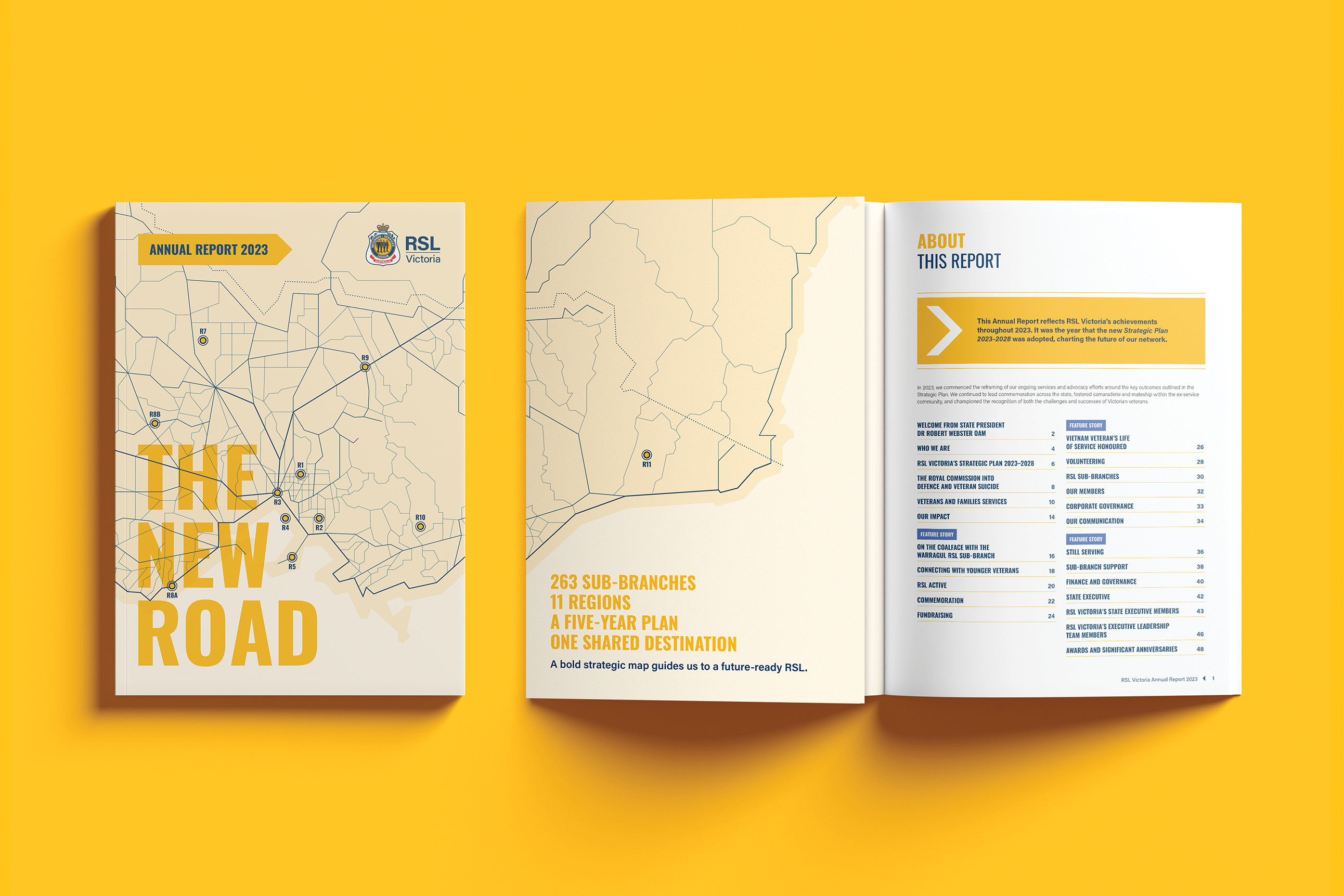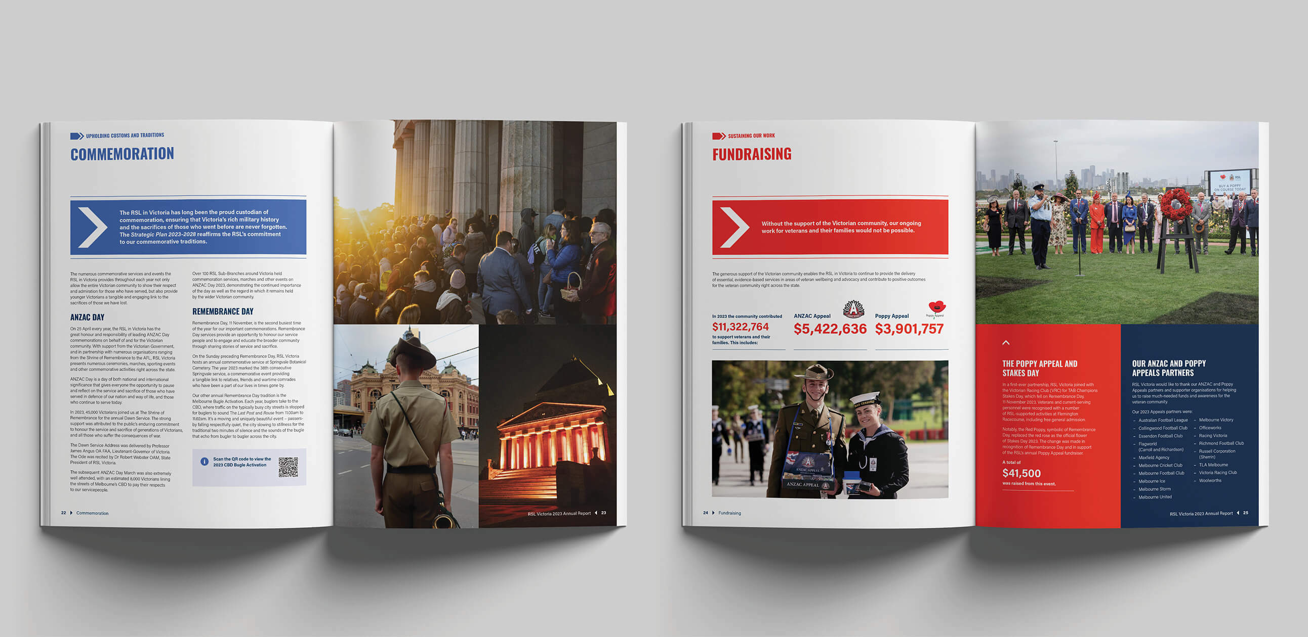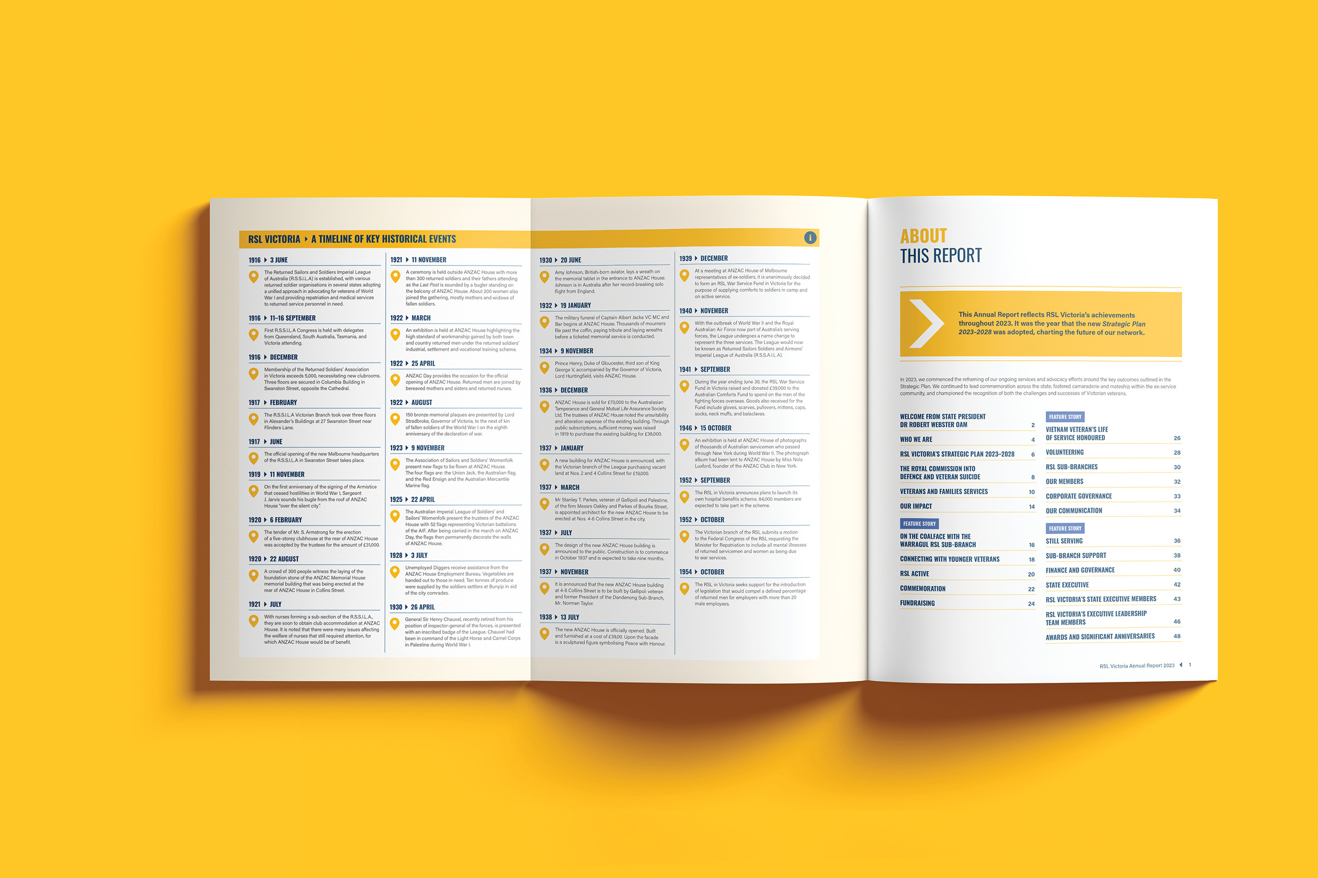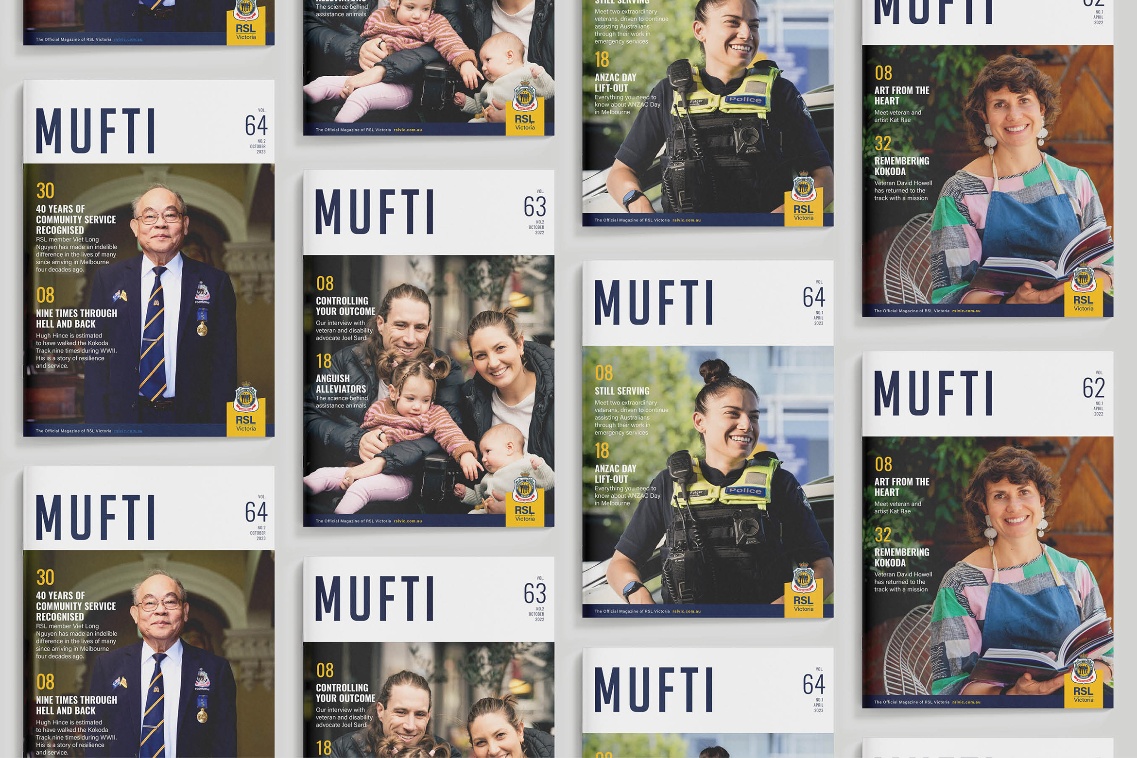 Over the years, we've collaborated with them on various design pieces and publications. From their Annual Reports to their bi-annual magazine MUFTI, to Anzac Day collateral like their event map, we’ve worked with RSL Victoria to make their content visually accessible, engaging, and functional for their wide-ranging audience.