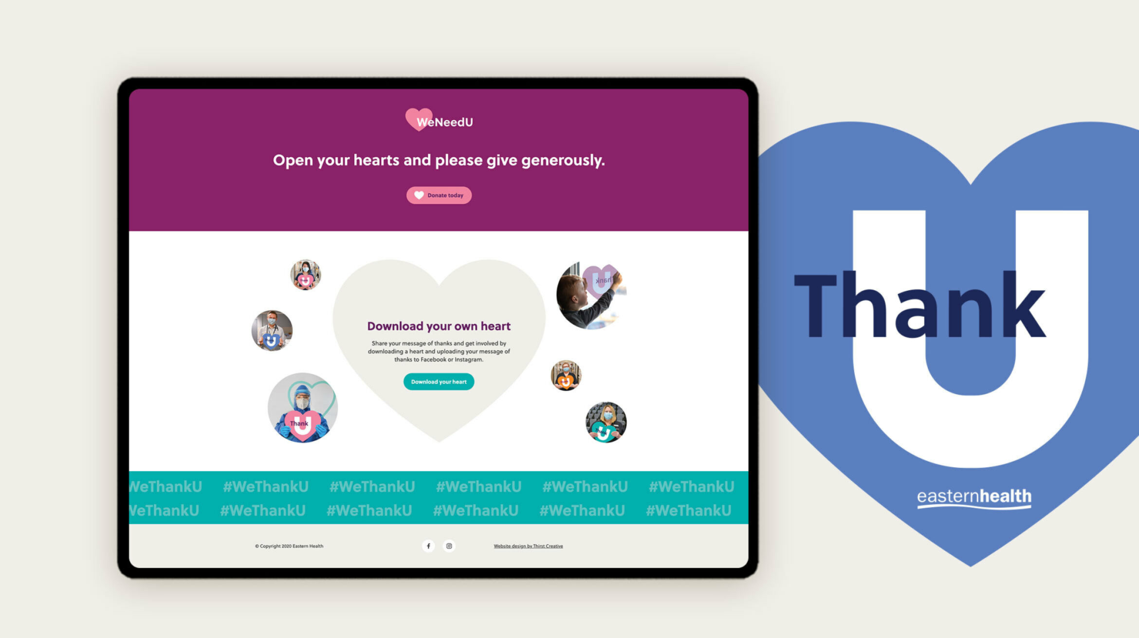 To unite the campaign and inspire the community with appreciation, our team of strategists and designers devised a heart shape brand identity. Rolled out in a variety of soft-tone colours, the ‘ThankU’ heart icon immediately generates feelings of care, kindness and gratitude.